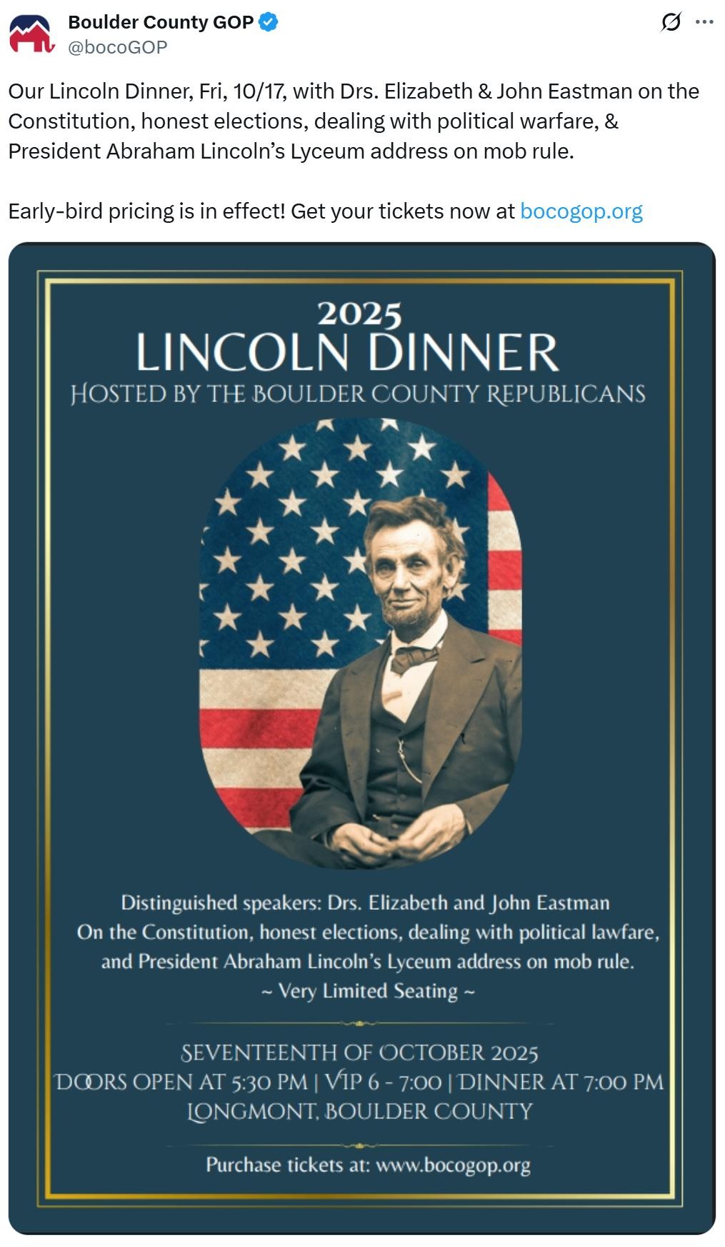 Last week, the Boulder County Republican Party announced their keynote speaker for their upcoming annual fundraiser known as the Make-Lincoln-Turn-Over-In-His-Grave Dinner–and for all the deliberately provocative names local Republicans regularly fly in to headline their fundraisers, their choice in this locale is what the experts call a real doozy: