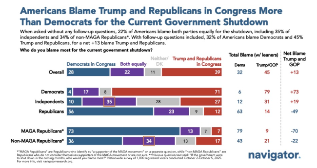 That doesn’t mean there isn’t shutdown-related news to discuss. Here’s the latest in our weekly-ish shutdown updates, starting with the latest polling from Navigator Research: