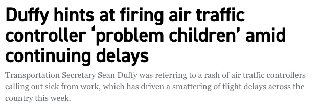 “Problem children” air traffic controllers who call out sick as a way to protest the government shutdown could lose their jobs, Transportation Secretary Sean Duffy warned Thursday.