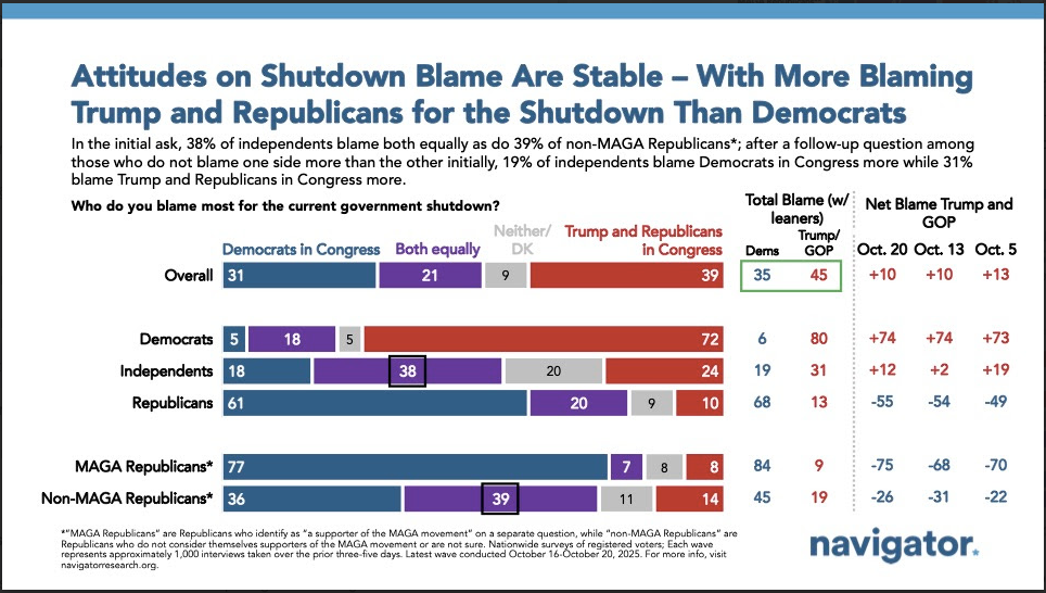 Meanwhile, as Navigator Research reports, Americans continue to be clear-headed about who to blame for the shutdown: