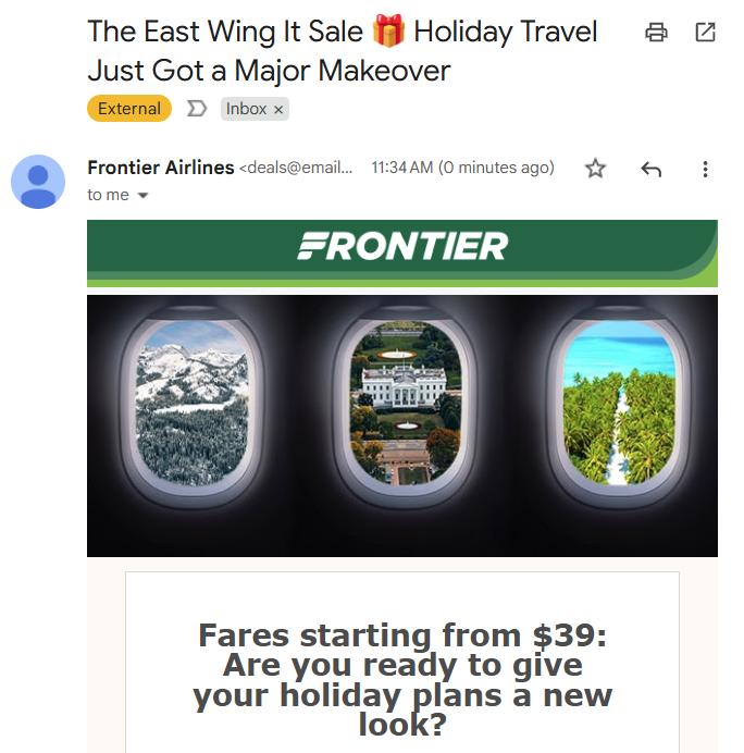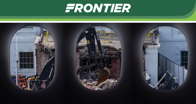 That’s right, folks! In honor of President Donald Trump’s controversial teardown of the White House’s historic East Wing to build a gold-plated ballroom that will dwarf the rest of the White House when completed, executed without notice in contravention of prior promises in the middle of a shutdown of the federal government while lawmakers battle with Trump to prevent massive increases in health insurance premiums next year, Frontier Airlines is running an “East Wing It Sale” so travelers can give their holiday plans…a “new look.”