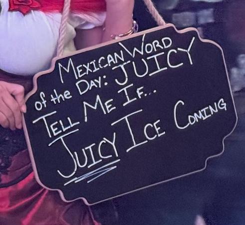 The sign reads: “Mexican Word of the Day: Juicy. Tell me if juicy ICE coming,” an apparent pun on “Tell me if you see ICE coming.” ICE is an acronym for U.S. Immigration and Customs Enforcement. Standing near her in the photo is a man dressed as an ICE agent.