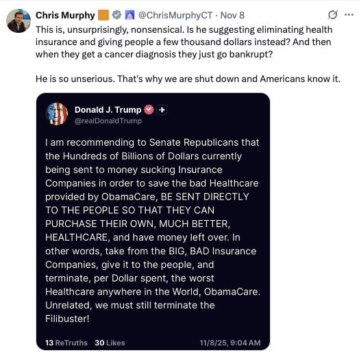 While Trump and his congressional allies prevailed in the short-term political stare-down, the GOP now faces an impossible choice over the next several weeks. They either must agree to extend those Covid-era insurance subsidies or take sole blame for killing an effort to continue assistance that has overwhelming public support. [Pols emphasis]