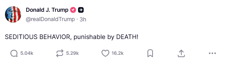 At a time when we regularly struggle for words to adequately capture the significance of news events that regularly feel dangerously unprecedented, while at the same time years of unhinged rhetoric has dulled our collective senses to the point that words lose their impact, offering commentary that meaningfully contributes to the reader’s understanding of what is happening is increasingly difficult. But when the President of the United States is calling for the literal execution of his political opponents, with a Justice Department at his disposal that has proven it will pursue Trump’s vendettas beyond the limit of the law…
