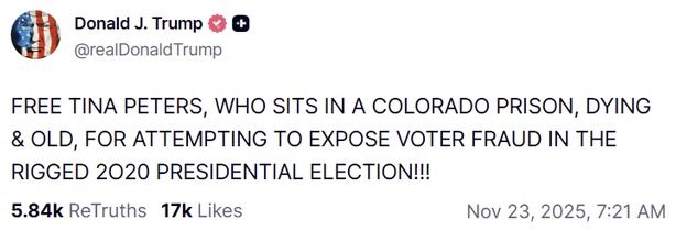 NEW: As President Trump increases pressure on Colorado Governor Polis to free Tina Peters, a close ally of Peters is calling for Gov Polis and Attorney General Weiser to be executed.