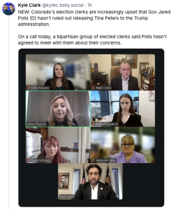 On the other hand, Polis hasn’t explicitly told a bipartisan group of county clerks — or Attorney General Phil Weiser — that he is NOT considering handing Peters over to the DOJ. This has led to some obvious concerns from the clerks.