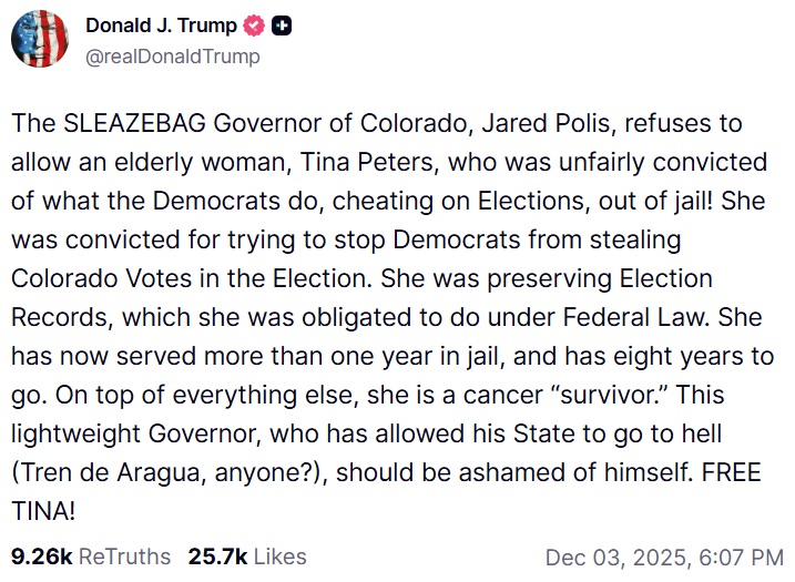 This is not the first time Trump has taken to Truth Social to support Peters. In August, Trump wrote similar sentiments on social media. He said Wednesday that Polis has refused to release Peters from state prison into federal custody after the Federal Bureau of Prisons wrote to Colorado prison officials requesting such a move…