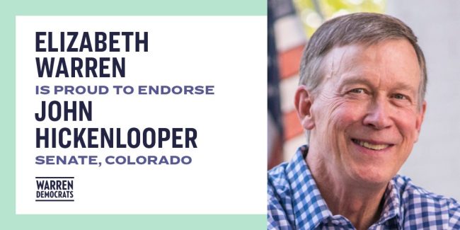 Just days after state Sen. Julie Gonzales of Denver announced her challenge to incumbent Democratic Sen. John Hickenlooper while at the same time sort-of renouncing her ties to the Democratic Socialists of America (DSA), one of the foremost progressive leaders in the U.S. Senate is jumping in to shore up Hickenlooper’s left flank. Here are some kind words for Colorado’s junior U.S. Senator in today’s joint fundraising appeal from Sen. Elizabeth Warren of Massachusetts: