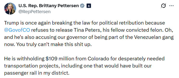 At this point, the justifications thrown out by the administration for these obvious acts of retaliations are more or less pro forma. Between the cancelled funds, investigations, lawsuits, mass layoffs, relocations, and overt threats by Donald Trump himself against the state of Colorado, there is no question that our state is being singled out for punishment for a litany of Trump’s personal grievances going all the way back to the Colorado Republican Party’s #NeverTrump snubbing in the 2016 presidential caucuses. We’re the state that took Trump’s qualifications to run as an insurrectionist to the Supreme Court. And in a Colorado state prison sits the last person still serving time over Trump’s refusal to accept defeat in the 2020 presidential elections.