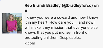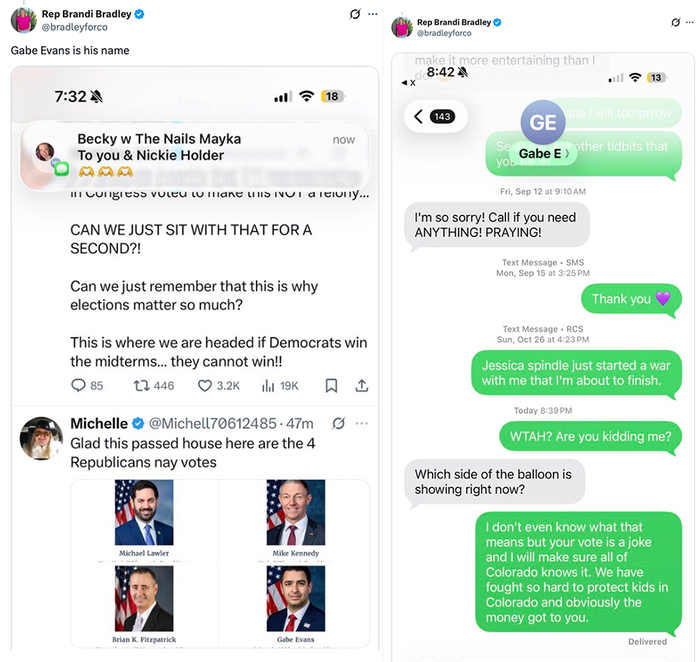 Anyway, Evans’s decision to vote “NO” on this legislation so angered Rep. Bradley that she went on a social media tirade that included posting an apparent back-and-forth discussion with Evans via text message: