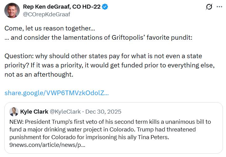 As the Washington Post reports, Trump’s veto of Rep. Lauren Boebert’s bill funding the construction of the Arkansas Valley Conduit drinking water project could be the breaking point for local Republicans who have tried to remain loyal while Trump unleashes indiscriminate hell on their constituents. How can “law and order” MAGA loyalists like Rep. Gabe Evans justify this brazen extortion?