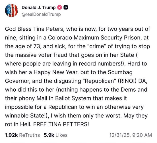 Although debunking Trump’s ridiculous excuse is helpful, it’s not as important in this case because Trump has already repeatedly declared his true motives for every adverse decision he makes against the state of Colorado. The morning after he vetoed Boebert’s Arkansas Valley Conduit bill, Trump lashed out again at Gov. Jared Polis as well as Republican Mesa County DA Dan Rubinstein, calling for them both to “rot in hell” while once again impotently demanding Peters’ release (top right). At this point, only a fool or a sycophant would try to defend the veto of this unanimously-passed bill for clean drinking water to an overwhelmingly Republican corner of the state on the merits.