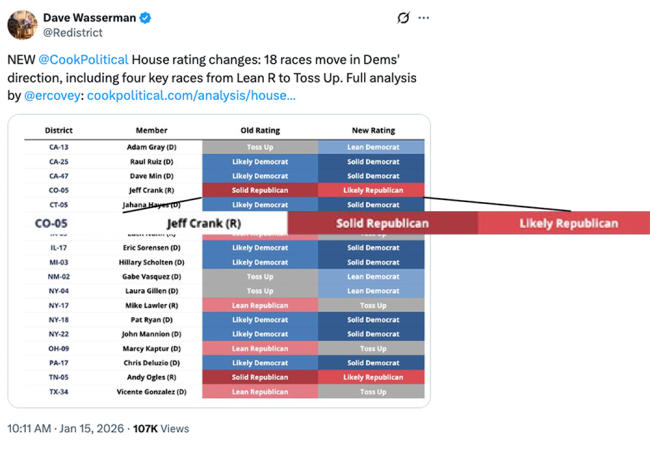 President Trump carried CO-05 by 9 points in 2024 after winning the district by 18 points in his first race in 2016. While demographic shifts have diluted a Republican advantage in El Paso County, this is still a seat that the GOP really shouldn’t have to worry about in 2026. But a combination of poor approval ratings for Trump; strong headwinds for Democrats; and Crank’s absolutely feckless freshman performance have given Democratic challenger Jessica Killin more than a fighting chance in November (assuming she wins the Democratic nomination over newly-minted Democrat Matt Cavanaugh).