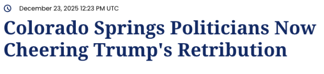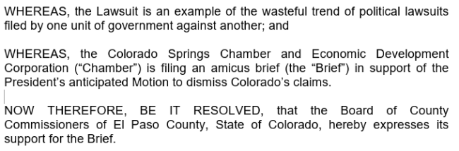 Another elected body in Colorado Springs has entered the fight against Colorado Springs. Last week El Paso County Commissioners joined an amicus brief filed by the Colorado Springs Chamber and Economic Development Corporation that is more than just opposing Weiser’s lawsuit — the brief actually SUPPORTS the Trump administration’s legal arguments that it should be allowed to screw over another state out of spite. The rationale from El Paso County is beyond ridiculous: