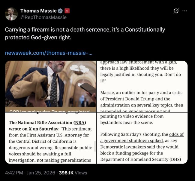 Another of Evans’ U.S. House colleagues, Thomas Massie (R-KY), wrote, “Carrying a firearm is not a death sentence, it’s a Constitutionally protected God-given right, and if you don’t understand this you have no business in law enforcement or government.”