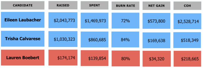 The headlines show that both Laubacher and Calvarese significantly outraised Boebert in the most Republican-leaning congressional district in the state (Donald Trump carried CO-04 by 18 points in 2024), but those gaudy contribution totals are misleading. All three candidates are burning through their donations at an unsustainable rate: