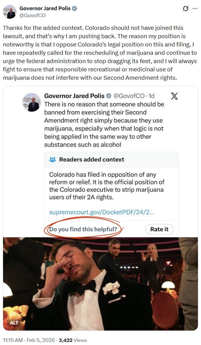 That assessment appears correct, as Colorado’s liberal-tarian Gov. Jared Polis has come out strongly against Attorney General Phil Weiser’s decision to join this lawsuit that could strip otherwise legal marijuana consumers in Colorado of their gun rights. Polis’ release on the subject this week:
