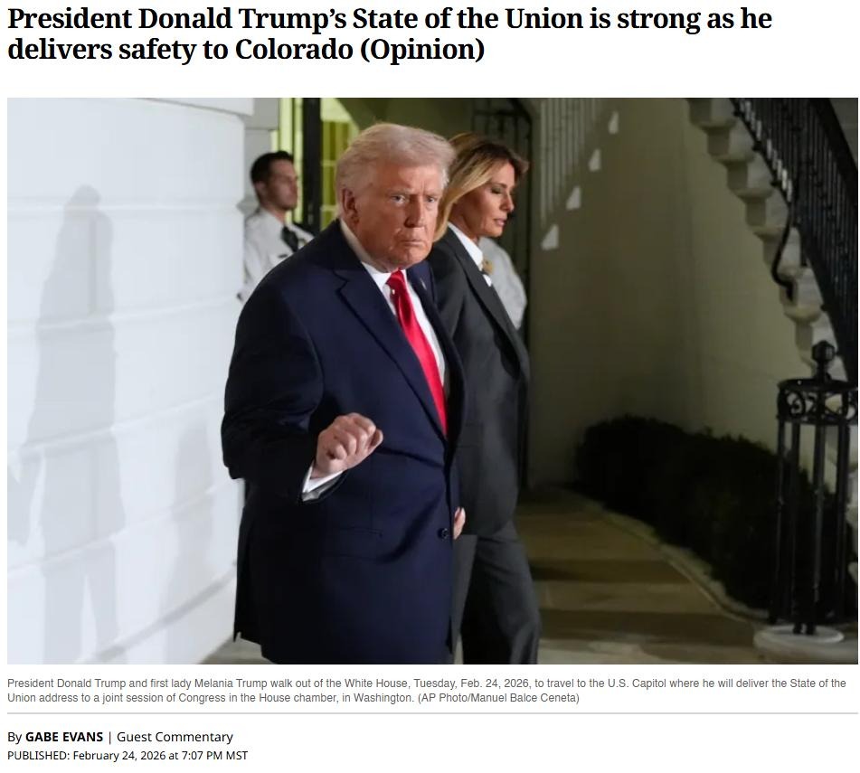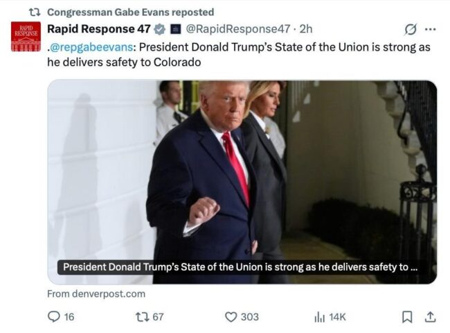 Instead of doing the smart thing and keeping his head down, America’s Most Vulnerable Incumbent™ Rep. Gabe Evans once again made the ill-advised decision to lead the SOTU defense of the Trump administration in Colorado, publishing a guest opinion in the Denver Post that was embargoed until moments after Trump began speaking: