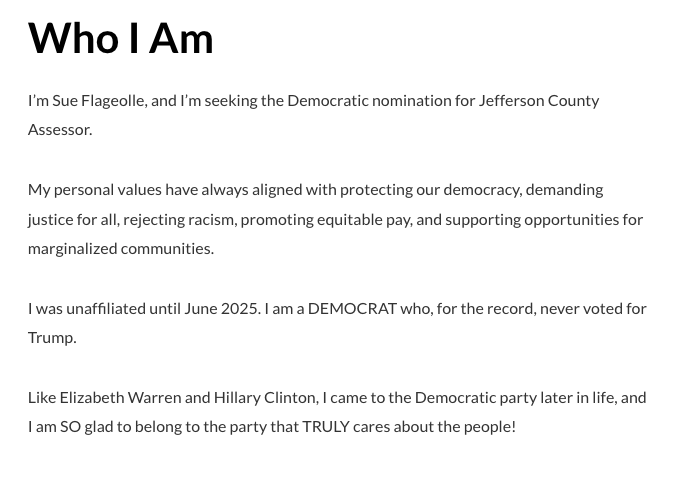 Flageolle is one of two people seeking the Democratic nomination for Jefferson County Assessor and hoping to make the ballot via the county assembly on Saturday. She is currently the Deputy Assessor and is running against current Jefferson County Commissioner Andy Kerr, a former State Representative and State Senator.