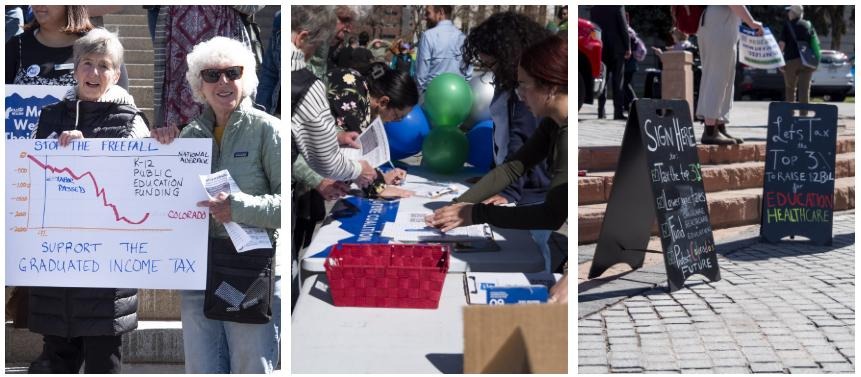 Educators, health care workers, local officials, and others rallied on the steps of the state Capitol Tuesday to launch a campaign to place an initiative on the November ballot that would ask voters if they want Colorado to implement a graduated income tax.