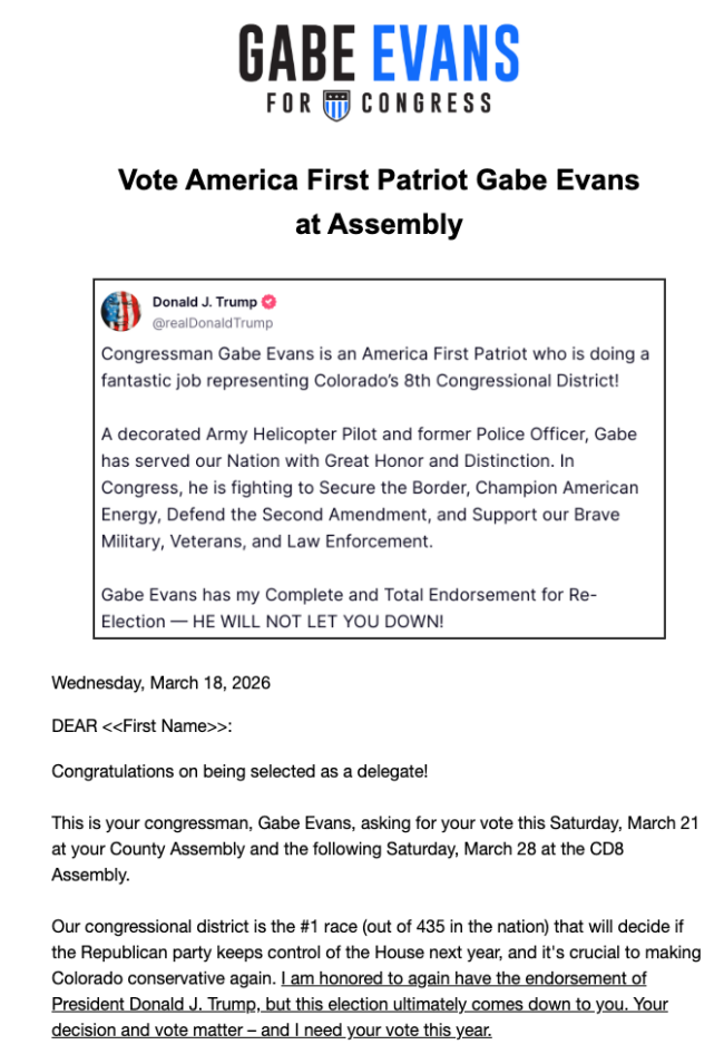 The email also featured a tweet by Trump stating, “Congressman Gabe Evans is an America First Patriot who is doing a fantastic job representing Colorado’s 8th Congressional District!”