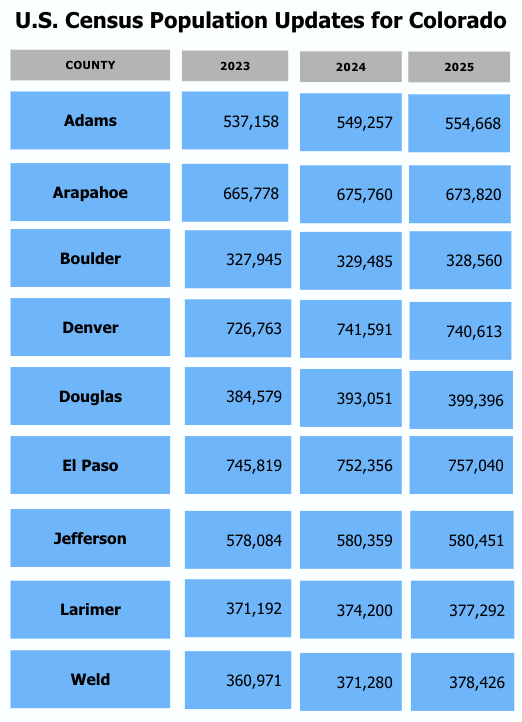 There are a few minor decreases in the chart above, but Colorado generally saw population GROWTH between 2024 and 2025. When you compare 2023 and 2025, however, the growth is evident across the board.