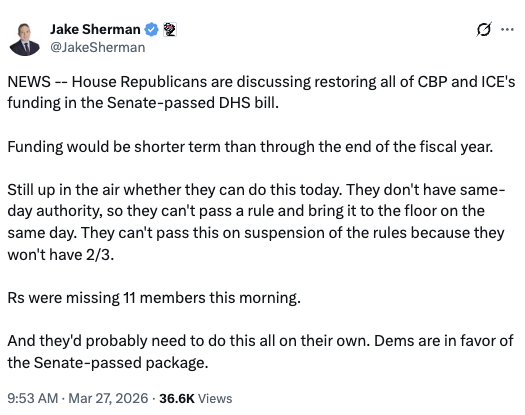 The Senate bill would fund the Transportation Security Administration and the rest of DHS except for ICE and CBP. The Senate passed it by voice vote with only a handful of senators in the chamber.