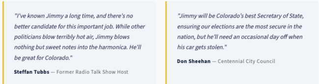 Right-wing radio host Jimmy Sengenberger published a website claiming that he would be a candidate for Secretary of State, which is a not-unbelievable claim given that Republicans still don’t have anybody willing to run for that office in November. We’ll give credit where it is due: Sengenberger’s “campaign” website is really funny. The site includes some great tongue-in-cheek “quotes” from alleged supporters: