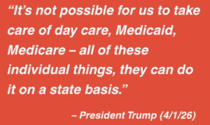 President Donald Trump on Wednesday said it’s “not possible” for the federal government to fund Medicare, Medicaid and child care costs, arguing that it should be up to the states to “take care” of those programs while the federal government focuses on military spending.