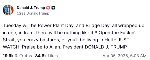 Trump says he’s “not at all” concerned about committing war crimes as he continues to threaten destruction of Iran’s bridges and power plants if they don’t meet a Tuesday-evening deadline to reopen the Strait of Hormuz.