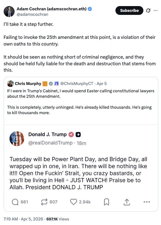 In case you missed it during your Easter celebration, President Trump on Sunday escalated his rhetoric on the Iran War to include profanity and threats of war crimes: