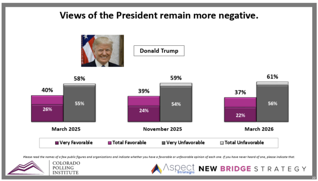 Trump — who lost the contest for Colorado’s electoral votes by 11 percentage points in 2024 — remains deeply unpopular in the Centennial State, with just 37% of voters holding a favorable opinion, compared to 61% unfavorable. That’s a more negative view than the figures of 40% favorable and 58% unfavorable that Trump scored in Colorado a year ago.
