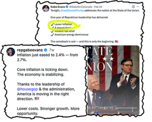 In mid-February, Evans boasted that inflation was down by 0.3% “thanks to the leadership of House Republicans and the [Trump] administration.” Ahead of Trump’s State of the Union speech, Evans claimed that “one year of Republican leadership has delivered…lower inflation.”