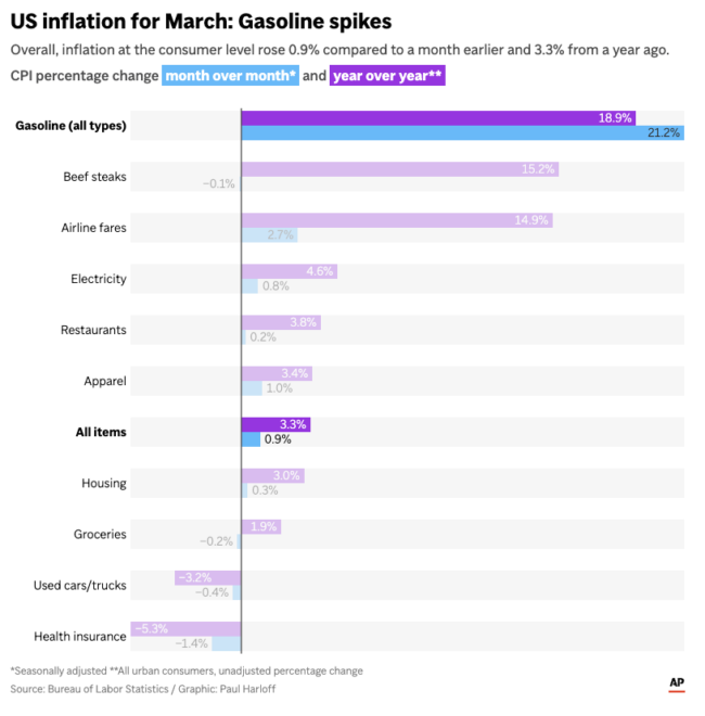 The overall energy index in the latest C.P.I. report rose nearly 11 percent, led by a 21 percent surge in gasoline prices. That alone accounted for nearly three-quarters of the monthly increase in prices in March, according to the Bureau of Labor Statistics. Fuel oil increased at an even faster pace, by 30.7 percent over the month. Other motor fuels, which mostly include diesel, jumped 30.8 percent.