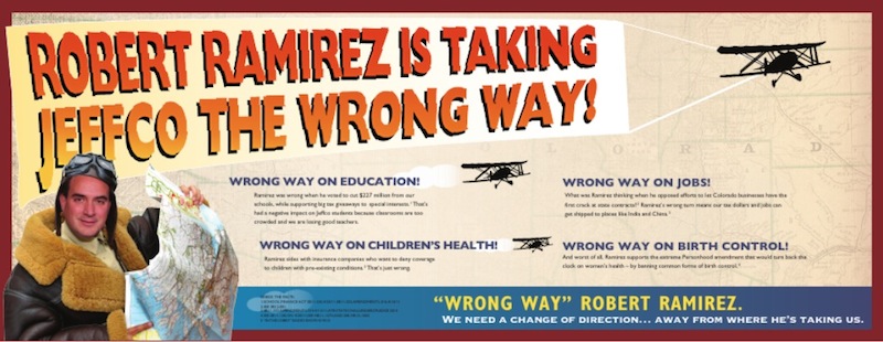 Fight Back Colorado, a group devoted to defeating anti-civil union lawmakers, has announced its first target: Representative Robert Ramirez, a Westminster Republican who narrowly won his race two years ago and who Fight Back Colorado says flip-flopped on civil unions. The group has sent mailers to voters in Jefferson County that depict Ramirez as a bomber pilot and say he’s “taking Jeffco the wrong way!”