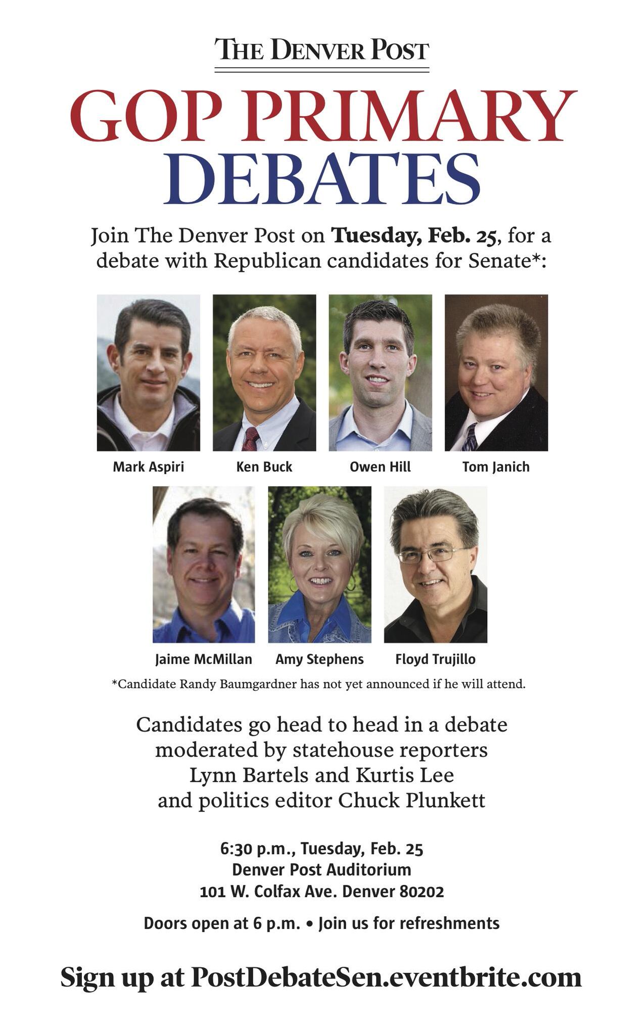 We haven't seen much publicity for this, but the next Denver Post GOP primary debate is coming up next Tuesday evening, featuring the large field of candidates vying for the chance to take on incumbent Democratic Sen. Mark Udall in November. The bar for participating in this primary debate appears pretty low, with minor candidates like Mark Aspiri and Floyd Trujillo–"Who?" you rightly ask–as well as Jaime McMillan, a vanity candidate from California who we understand withdrew this week from the race. Randy Baumgardner, who raised a whopping three grand in the last fundraising quarter, reportedly hasn't confirmed he is attending. But one name in particular struck us in the Post's long list of "Senate candidates" appearing Tuesday: