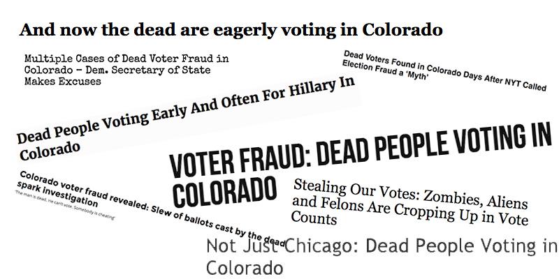 Brian Maass and CBS4 deserve some criticism for the ridiculous hyperbole flooding the conservative media today based on his report of four or five “dead voters” among nearly four million registered voters in Colorado. Maass’ reporting intentionally downplayed the actual number of cases, using words like “multiple” when “several” or even the correct single-digit number would have been more accurate–if less sensational. But the bigger problem is with the conservative media outlets completely untethered by a need for accuracy who distorted Maass’ report into something vastly worse than the facts support.