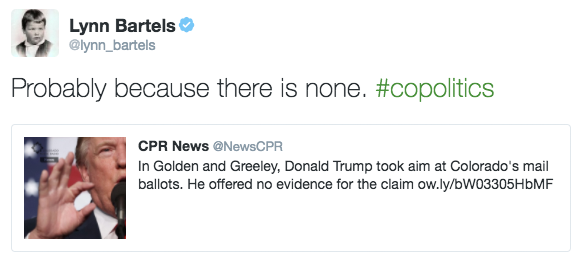 Trump’s “lack of understanding” about how elections work, either in Colorado or anywhere else, is nonetheless fueling a fresh round of conspiracy-making among Republicans bracing themselves for what may well be an historic defeat next week–and in the context of Trump’s vague threats to not respect the results of the election, a potentially scary development. As a Republican in the position of presiding his first statewide election this year, we have real sympathy for Secretary of State Williams and his longsuffering spox. Williams has to do the responsible thing, which is reassure the voters of Colorado that the system is sound, while not becoming too vocal in criticizing his party’s presidential nominee. It’s a tough needle to thread.