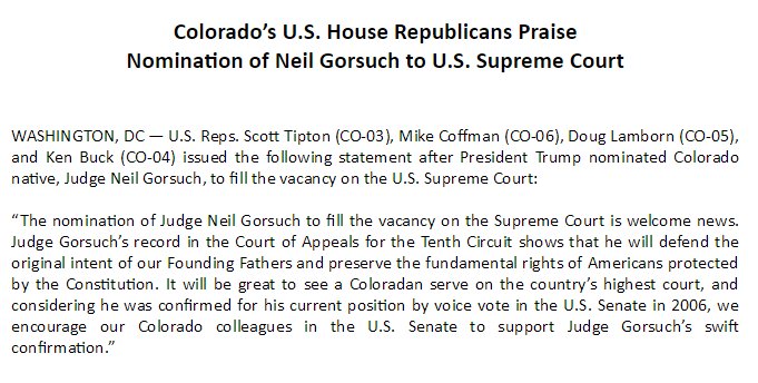 “He is an ardent defender of the Constitution and he has the appropriate temperament to serve on the nation’s highest court,” Gardner said. “Judge Gorsuch also adds to the court’s Western perspective, with his understanding of uniquely Western issues like water and public lands issues. I’m enthusiastic about the native Coloradan’s nomination and will work to ensure that his confirmation process is fair, thorough, and expedient.”