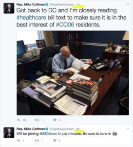 According to a Tweet from Rep. Mike Coffman’s office this afternoon, the Aurora Republican was hunkered down at his desk reading the new House Republican bill to repeal destroy Obamacare. But just this morning, as Coffman’s office also Tweeted, the Congressman went on “The Ross Kaminsky Show” on 630AM to offer his full-throated support of legislation that he may not have even read yet.