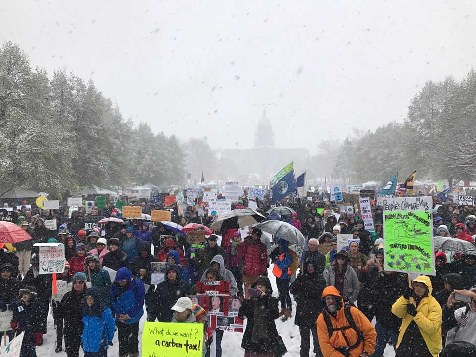 Several thousand demonstrators arrived in Civic Center Park yesterday morning despite about six inches of snow on the ground. Locals are of course well aware that it routinely snows in April in Colorado, even after one of the mildest winters anyone can remember as we had on the Front Range this year. Nonetheless, climate science deniers coast to coast used the supposed irony of a “climate march in the snow” to distract from, among other things, the hundred thousand or so who marched in sweltering 90-degree heat in Washington yesterday.