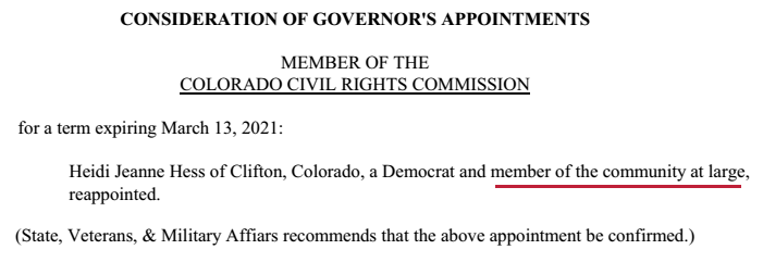 Heidi Jeanne Hess of Clifton, a West Slope organizer for the LGBTQ advocacy group One Colorado, had served on the commission since 2013. Records show that she was appointed as at-large member in 2013 and nominated for reappointment in March by Gov. John Hickenlooper as a member of the community at large…