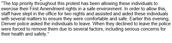 “The top priority throughout this protest has been allowing these individuals to exercise their First Amendment rights in a safe environment,” Gardner spokesman Alex Siciliano said. “At the request of the building, [Pols emphasis] Denver police were forced to remove them earlier this evening due to several factors, including serious concerns for their health and safety.”